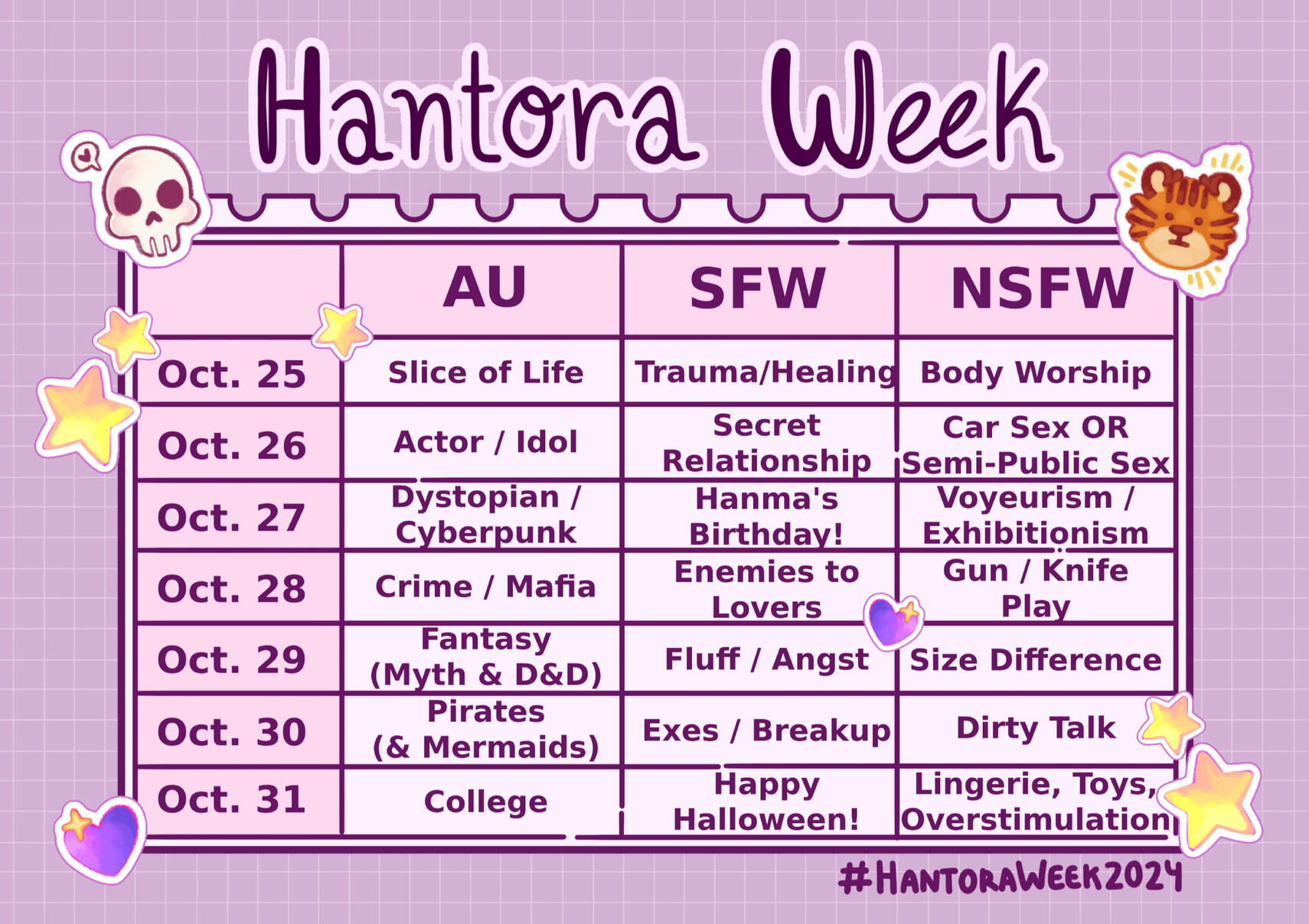 Use the tag #HantoraWeek2024 and/or tag the account @hantoraweek! If you'd rather publish anonymously, you can do so by either DMing us on our social media or via Retrospring. We will post your submission on your behalf.